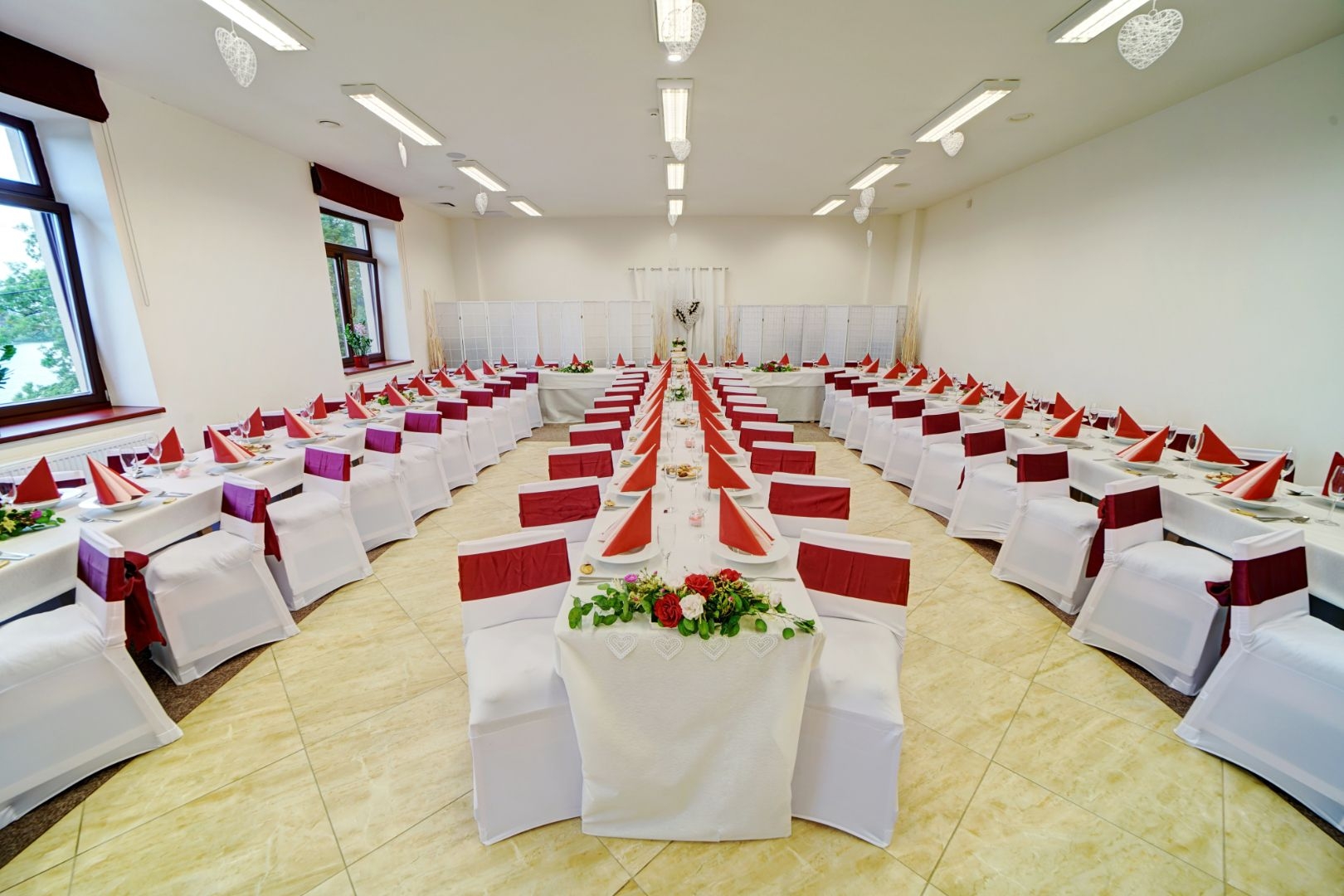 - Rozmístění stolů diskutujeme vždy se zákazníky. Sami si určíte, kde budete chtít umístit svatební tabuli, rautové stoly, stůl na dary, případný fotokoutek, místo pro živou kapelu či DJ atd.